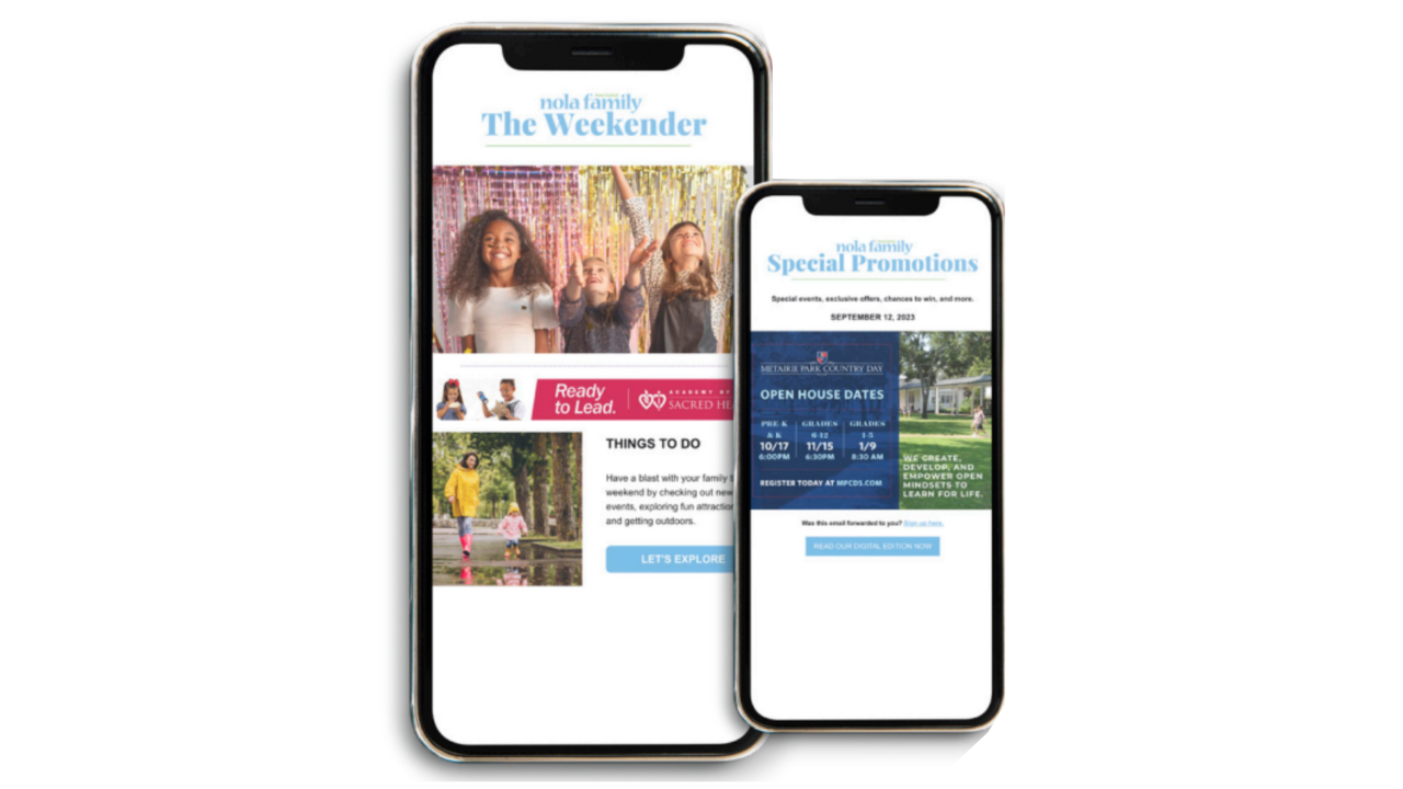Our Nola Family Magazine email newsletter delivers great ideas for family fun, including community events, tips, and giveaways. Connect with our audience with a top or bottom banner ad and keep your brand top of mind.